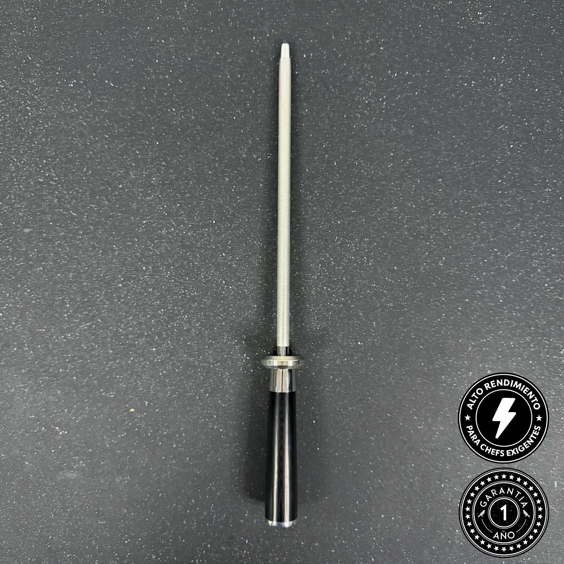 Su barra de 25 cm está recubierta con polvo de diamante sobre acero inoxidable, lo que garantiza una superficie resistente y efectiva para afilar con rapidez y uniformidad. La empuñadura de G10 combina ergonomía, firmeza y durabilidad, ofreciendo un manejo seguro y cómodo incluso en jornadas intensas.