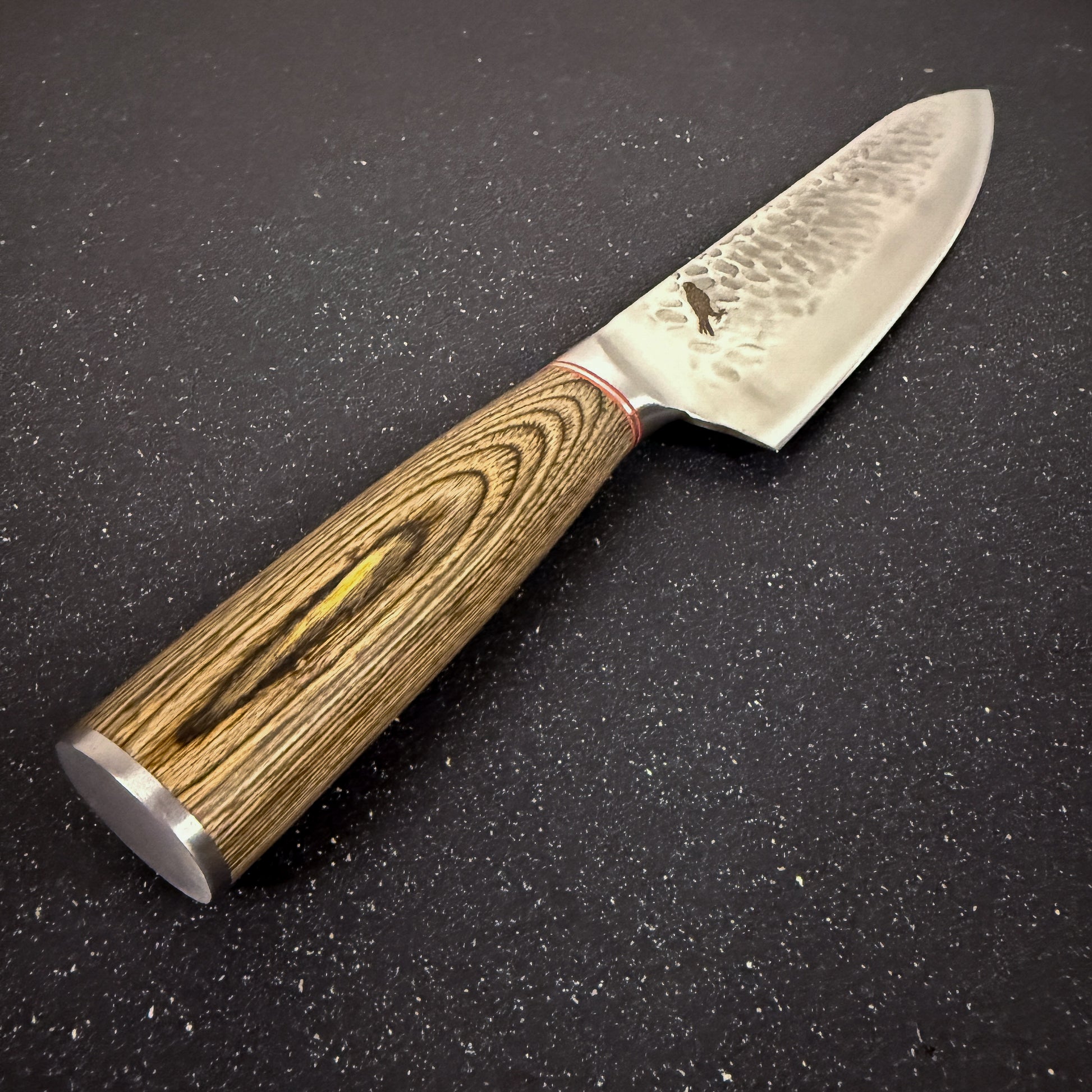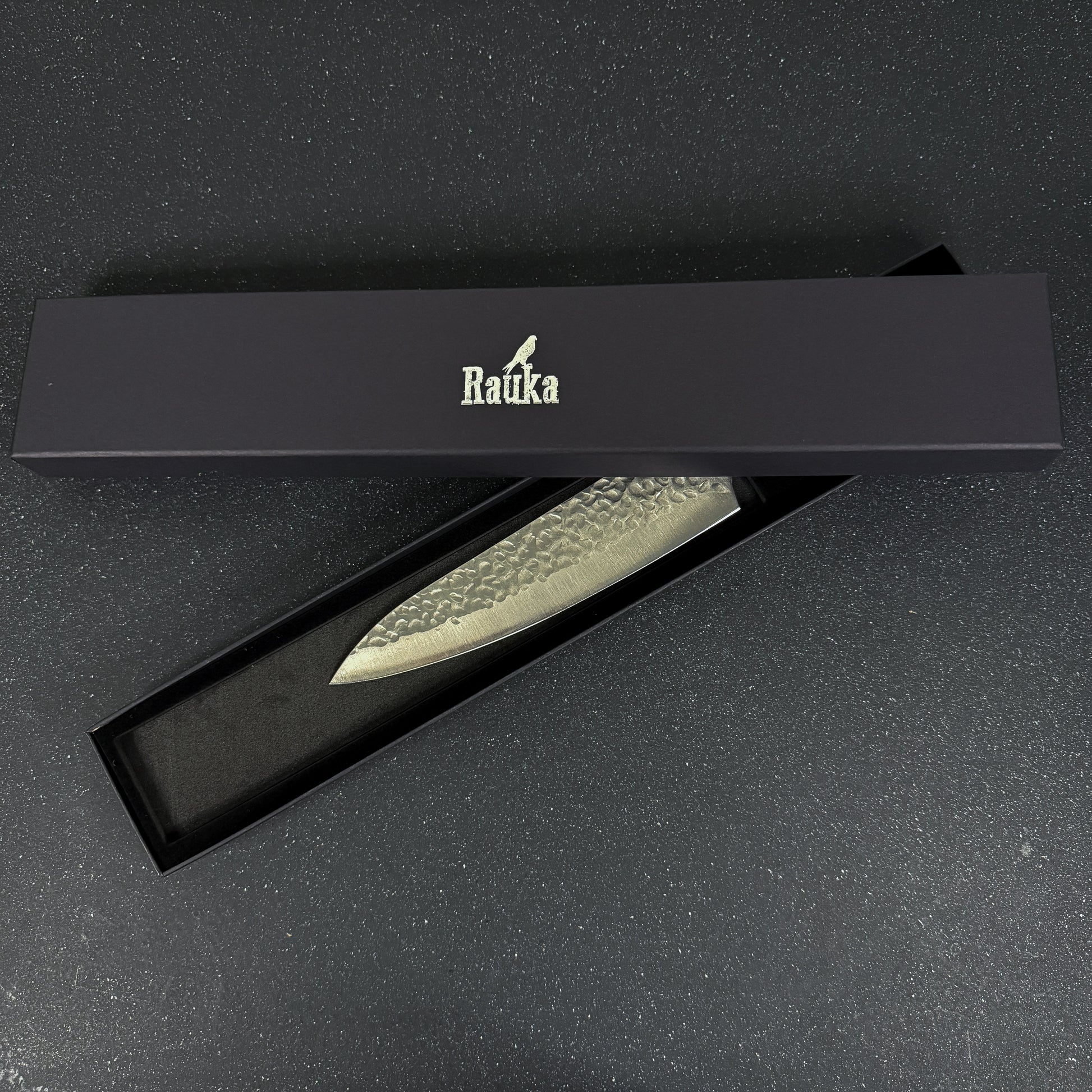 Su hoja de 20cm con espesor de 2,5mm permite cortes fluidos, firmes y controlados, ideal para picar, trocear y rebanar todo tipo de ingredientes. La empuñadura de Madera de Pakka ofrece un agarre cómodo y seguro, incluso en uso prolongado, aportando además un estilo elegante característico de Rauka.