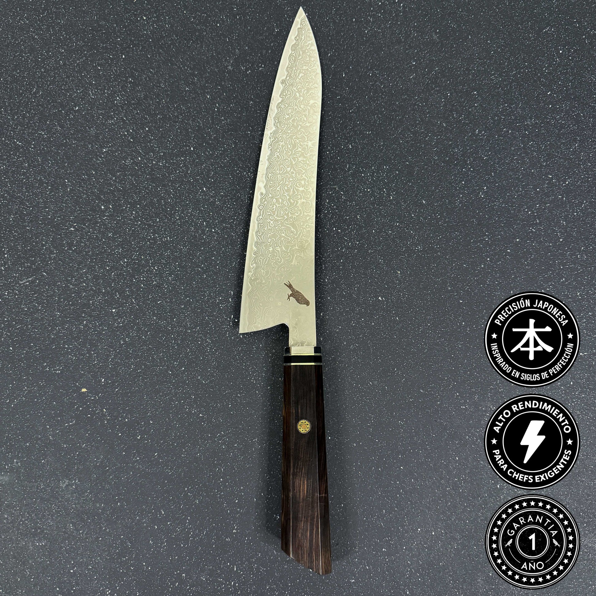 Forjado con 67 capas de acero Damasco 10Cr15CoMov, su hoja de 22 cm destaca por su filo excepcional, dureza superior y un distintivo patrón damasco que refleja su exclusividad. La empuñadura de madera de ébano aporta ergonomía, belleza natural y un control firme en cada movimiento.