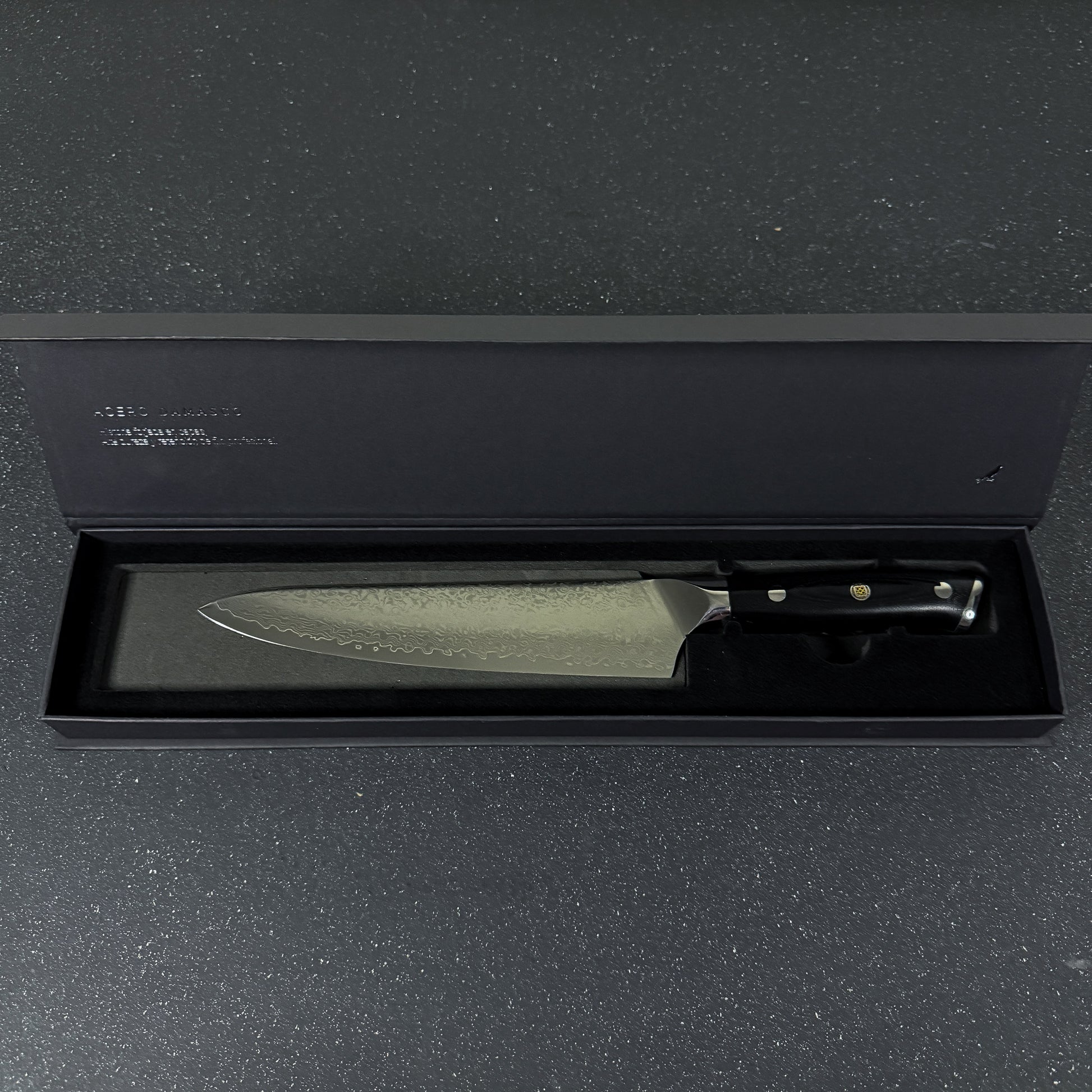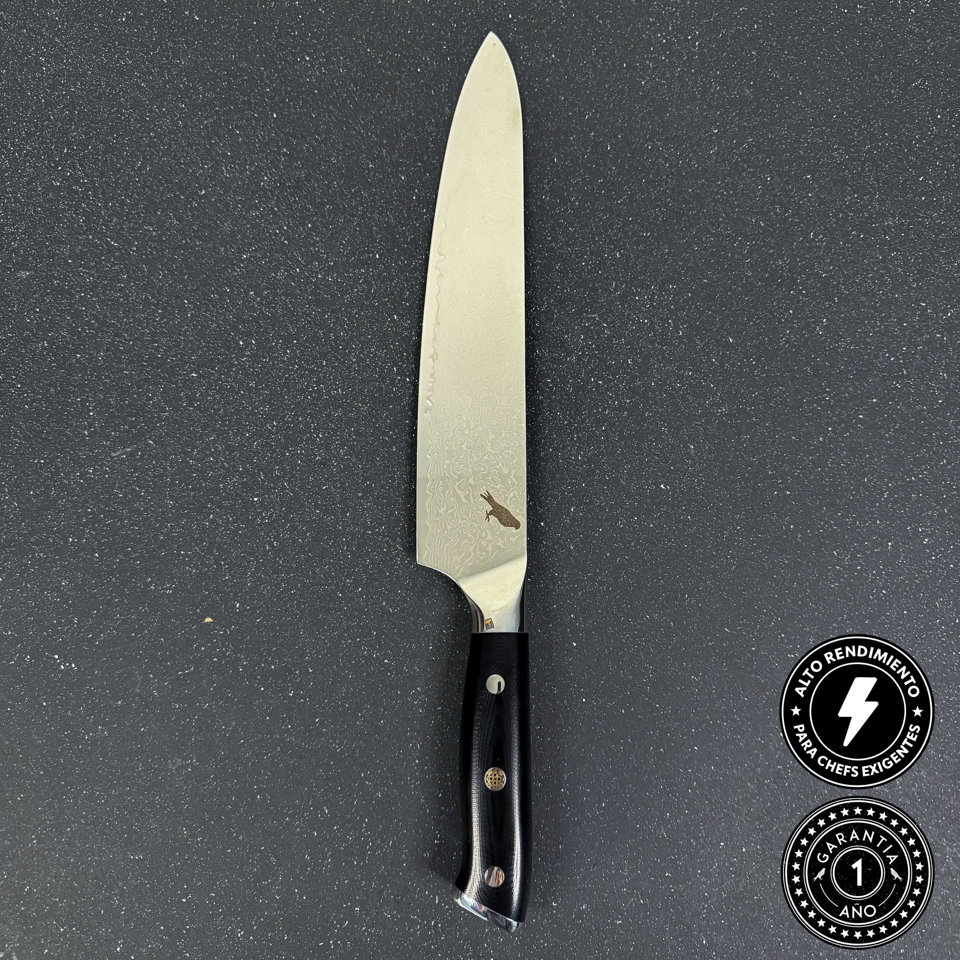 Forjado con 67 capas de acero Damasco AUS-10, su hoja de 23,5 cm combina un filo excepcional, alta resistencia y un hermoso patrón que evidencia su exclusividad. La empuñadura de G10 ofrece ergonomía superior y control firme en cada movimiento.
