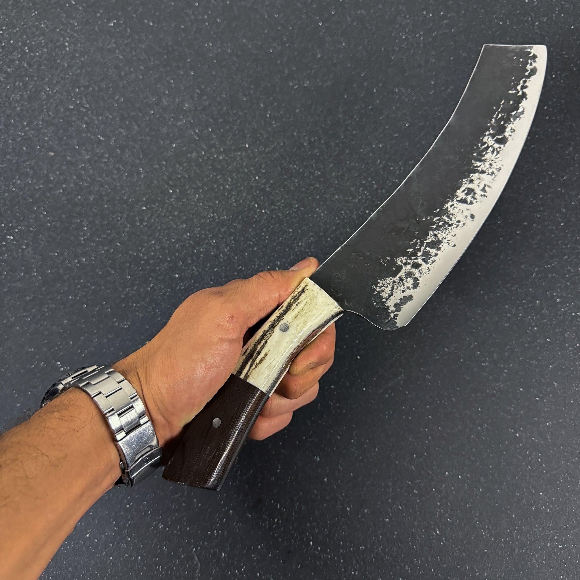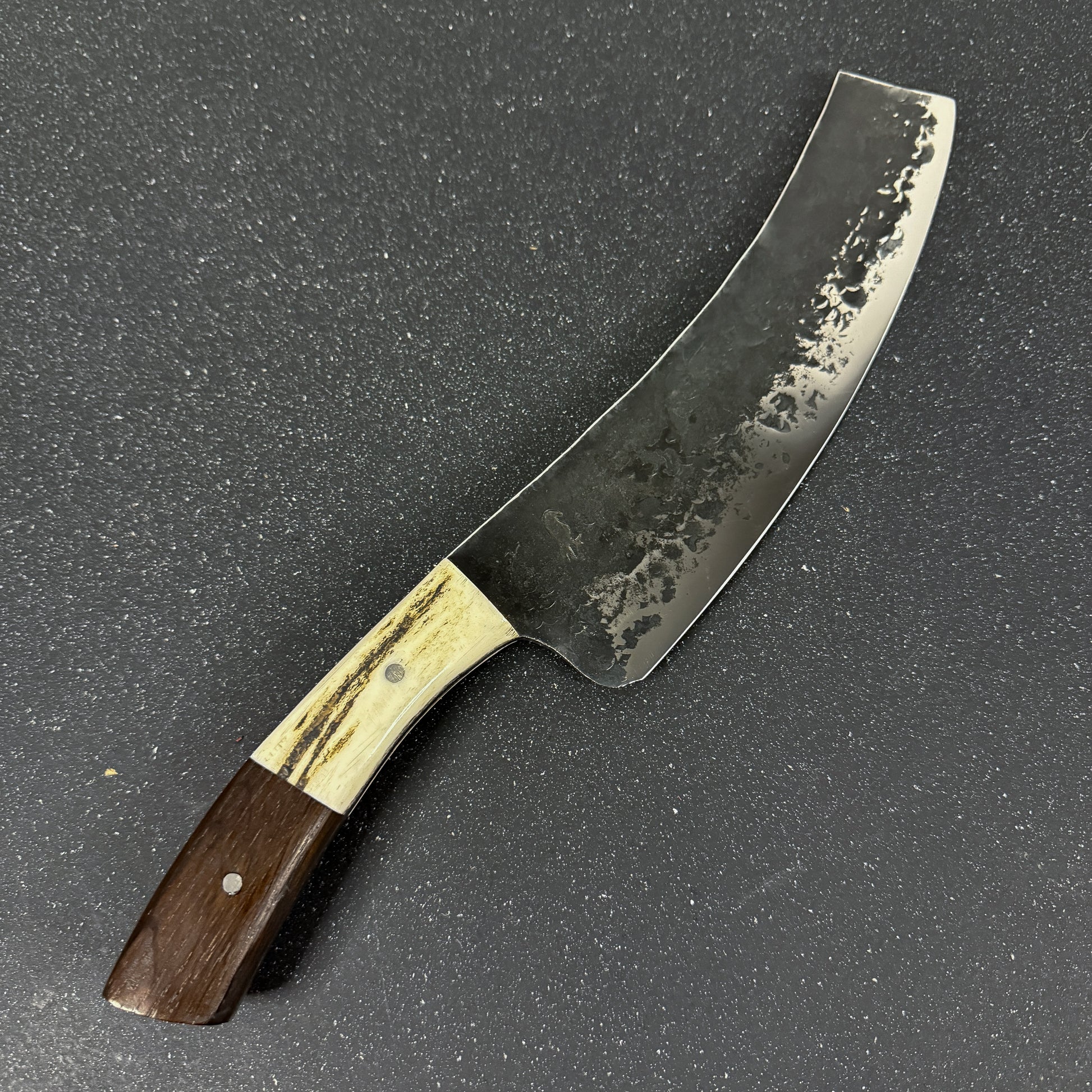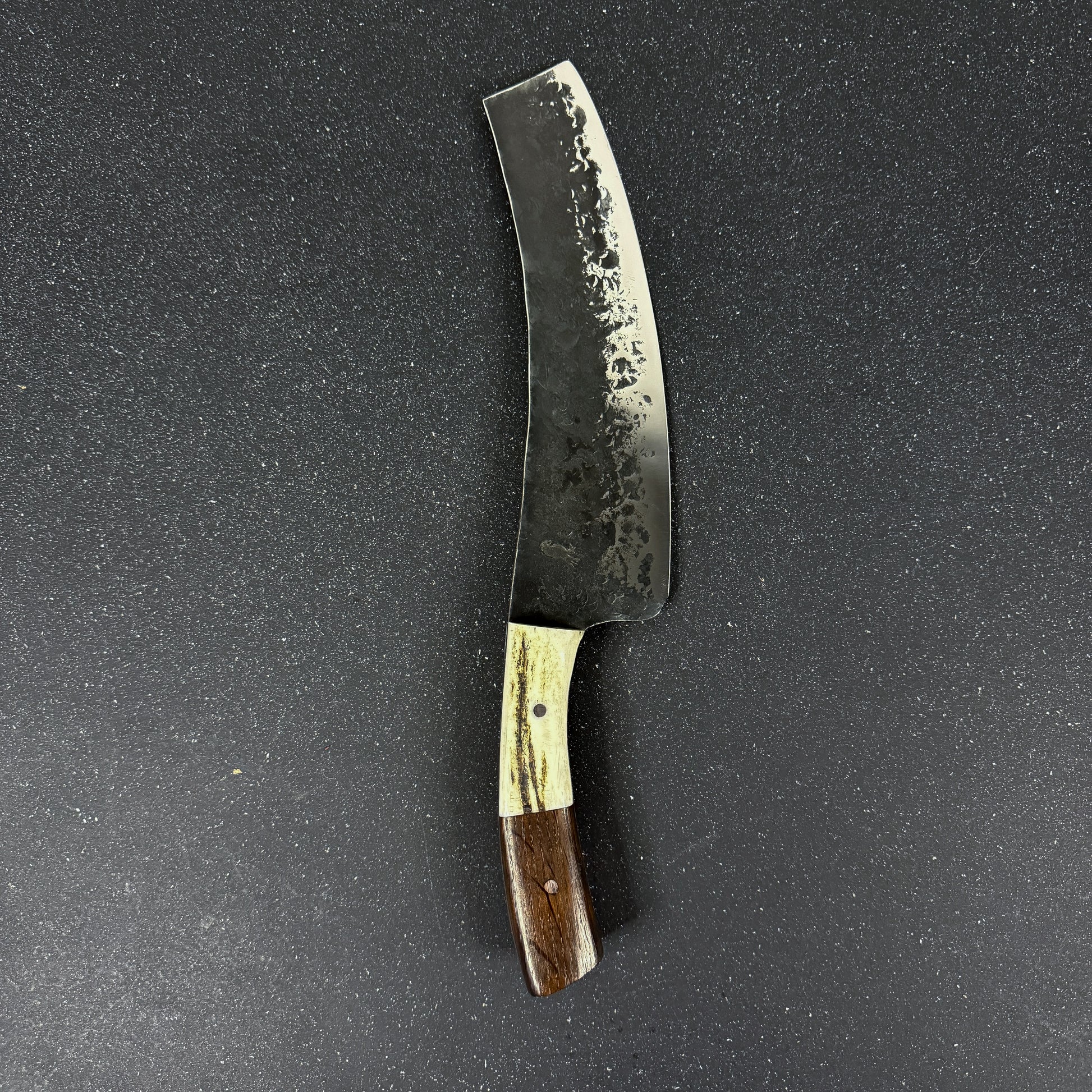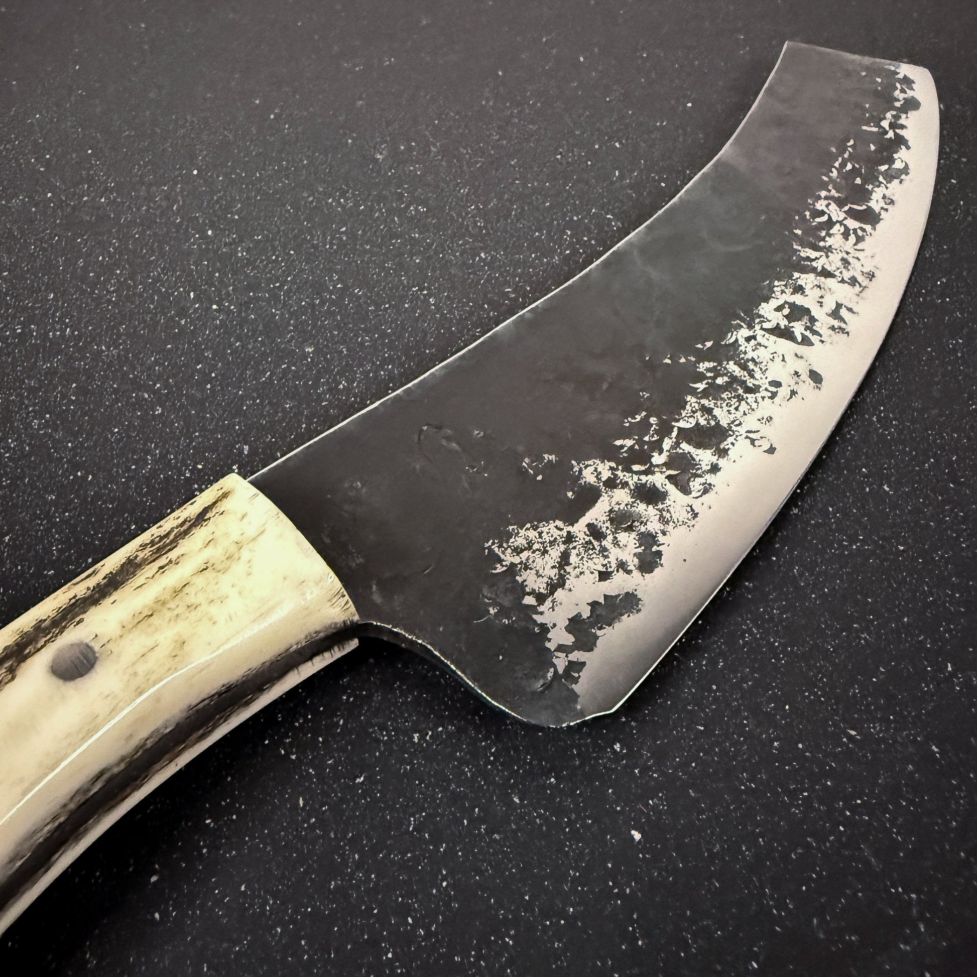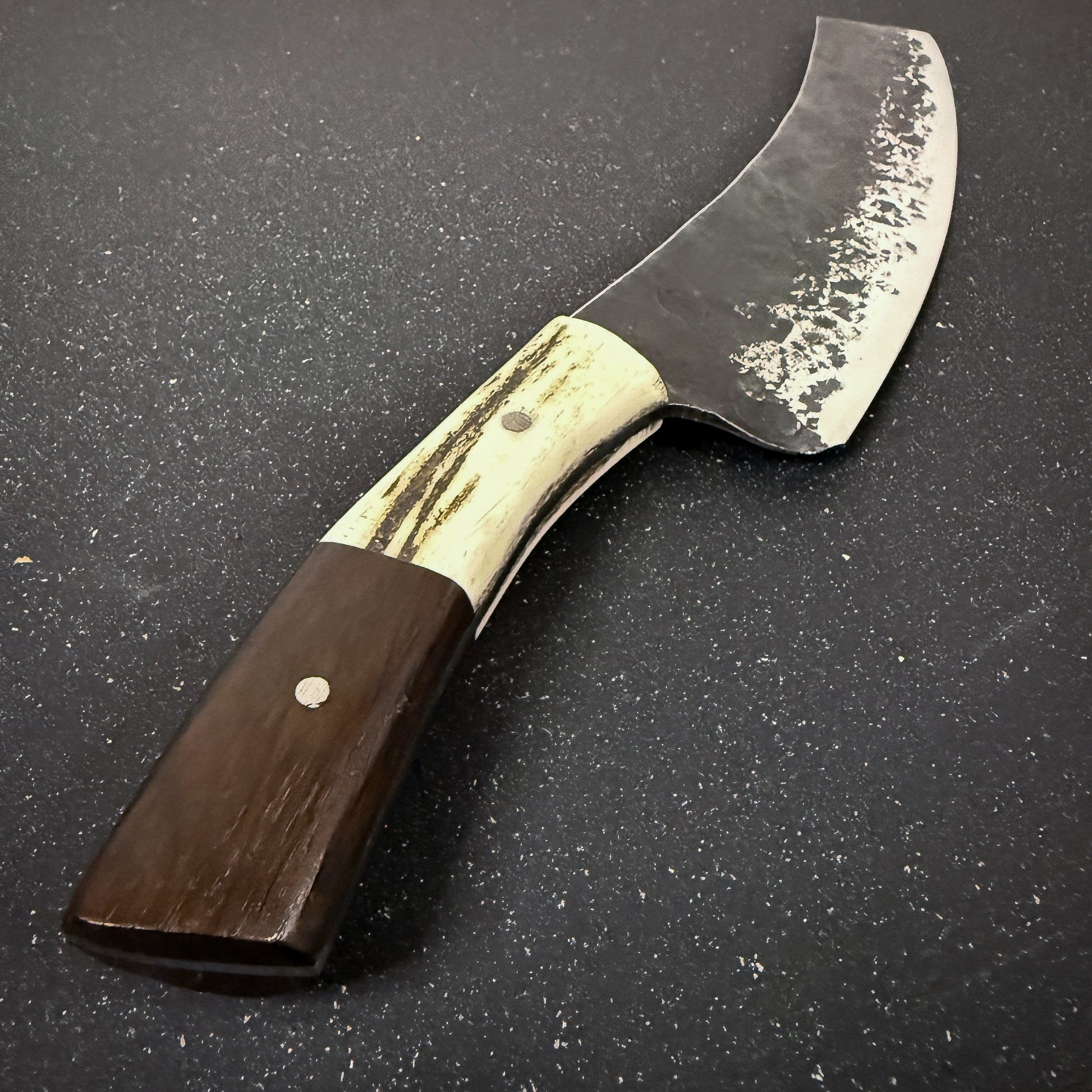 La hoja de este cuchillo está forjada a mano con acero inoxidable alemán 440 y empuñadura de espiga completa "Full Tang" con asta de ciervo rojo y madera de Corazón de Espino que le confiere un estilo elegante y un agarre seguro.