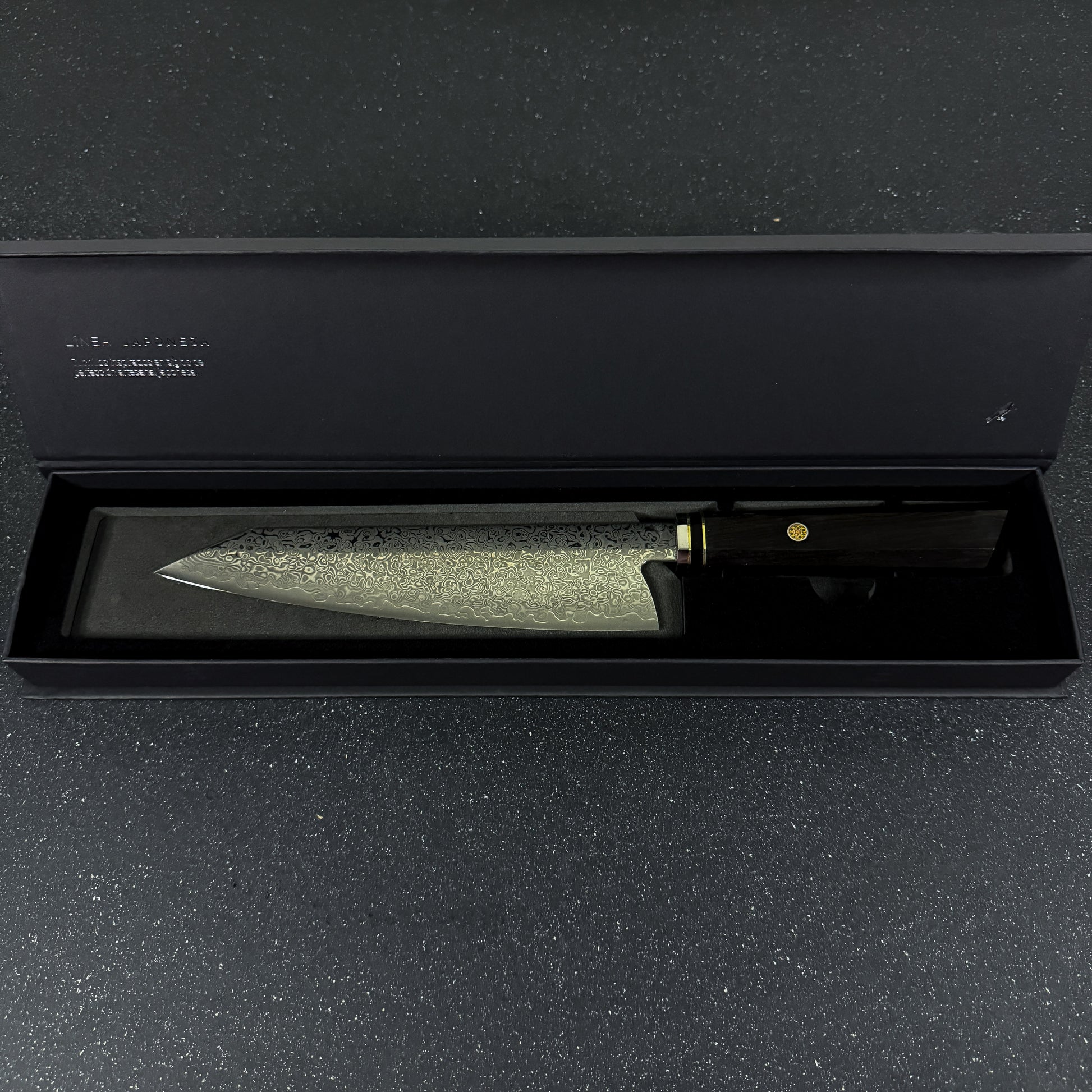 Forjado con 67 capas de acero Damasco 10Cr15CoMov, su hoja de 20 cm ofrece un filo sobresaliente, gran dureza y un impresionante patrón damasco que evidencia su exclusividad. La empuñadura de madera de ébano aporta elegancia, ergonomía y control en cada movimiento.
