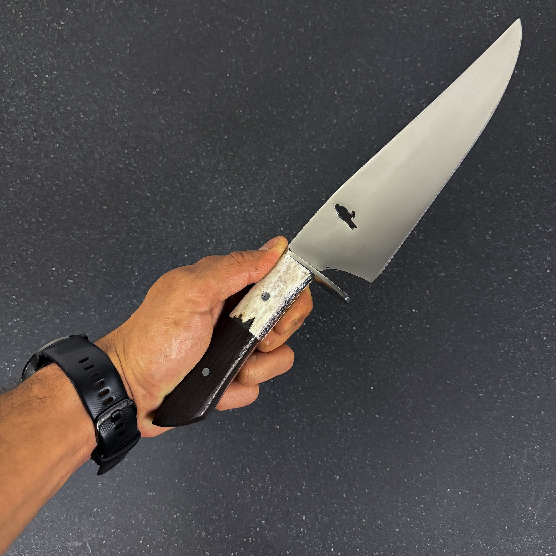 Te presentamos nuestro icónico modelo "Tucúquere". Forjado a mano con precisión y pasión, este cuchillo de 23cm de hoja de acero inoxidable 440, pulido espejo, es una obra maestra de la artesanía. La empuñadura de Asta de Ciervo Rojo le confiere un estilo elegante y un agarre seguro. Además, cuenta con una Guarda de Acero Inoxidable.