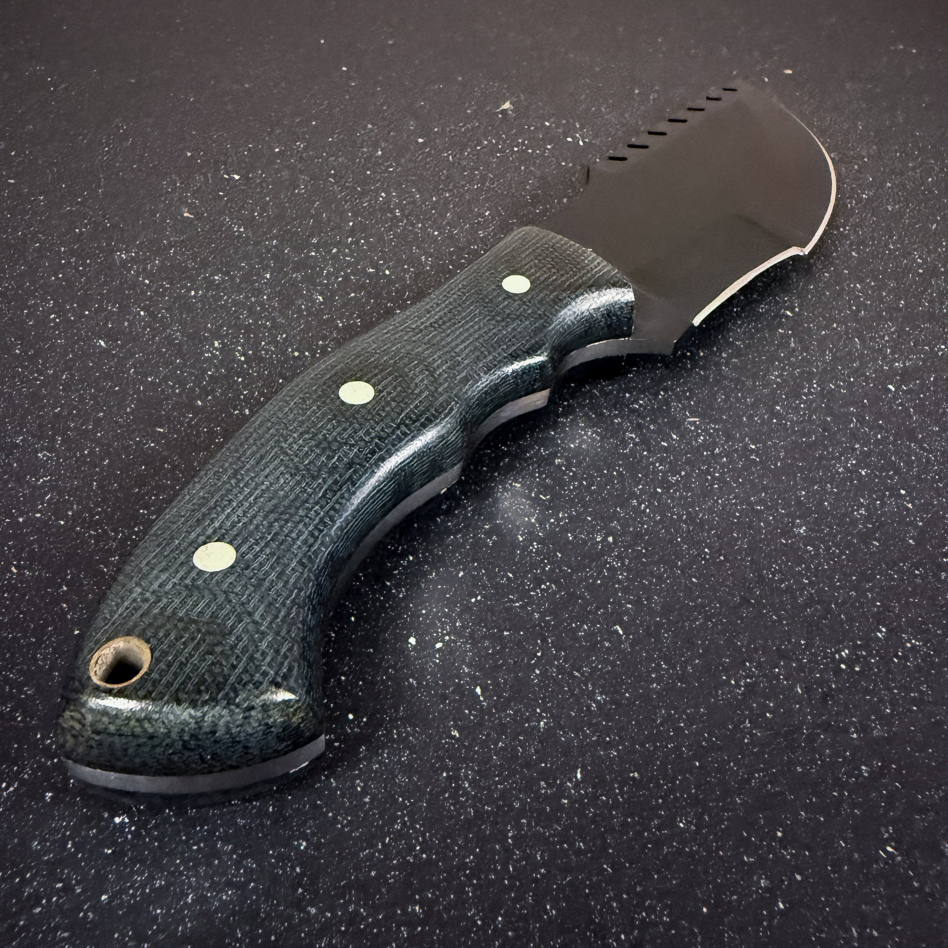 La construcción Full Tang garantiza máxima solidez y equilibrio, permitiendo transmitir toda la fuerza del usuario a la hoja de manera segura y eficiente. Su empuñadura de micarta oscura proporciona un agarre firme, ergonómico y altamente resistente a la humedad, cambios de temperatura y uso intensivo.